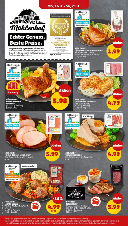 Bitte beachten Sie, dass dieser Text automatisch generiert wird und möglicherweise Fehler enthältMo, 16.53. - Sa, 21.3. Haltungs- Ft CRETE orm m] DD N CEE a EERE A A LL haltungsform.de À BESTE TN] PS Ep 2025 CCE Pld Kundenzufriedenheit N Echter Genuss. LEH-Eigenmarken Mübienhof AUSGEZEICHNETE É Beste Preise Aktion EIGENMARKE en ech g MÜHLENHOF bietet beste Falsh ir Frische deutsche Enten-Schenkel® gu de, me Mit Rückenstück, HKLA, versch. Gewichte, z. B. 200 g ERD PN Ei Haltungs- Haltungs- orm orm =) na nm a haltungsform.de haltungsform.de — SR) % dr D Æ Aktion Packung ktion i GG MÜHLENH IOF MÜHLENHOF Frische Hähnchen- Dn, SS Frische Puten-Rouladen* ELLE Zum Selbstfüllen, AAA je 500-g-Packung Ee (1 kg=9.58) er re Haltungs- er Haltungs- Ca.700g orm orm na mA haltungsform.de haltungsform.de Aktion fr Te u MÜHLENHOF ted Frischer Kasseler-Lachsbraten* e Vom Schwein, besonders mager, Vom Schwein, versch. Gewichte, HA jekg Haltungs- form lue de bek Ku Frischluftstall 2 haltungsform.de 5 ien N er 4 nt { + 2 % an won pen 1 a ® DR u TCHER'. m Dean -16 Aktion MÜHLENHOF BUTCHER’S CENT Sirloin Steak® Frisches Rinder-Hackfleisch Black Angus, Rindersteak Le aus der Hüfte, Herkunft USA, je 400-g-Packung je 200-g-Packung 06_01-11-12-15 | (LKg = 12.48) (L kg = 29.95) 1 Ersparnis gegenüber dem Preis ohne PENNY App. Es gelten die Einlösebedingungen in der PENNY App. Dieser Artikel ist nur vorübergehend und nicht in allen Filialen erhältlich. Aufgrund begrenzter Vorratsmengen kann der Artikel bereits kurz nach Öffnung ausverkauft sein. Die Abgabe erfolgt nur in haushaltsüblichen Mengen. Alle Preise ohne Deko. Druckfehler vorbehalten.
