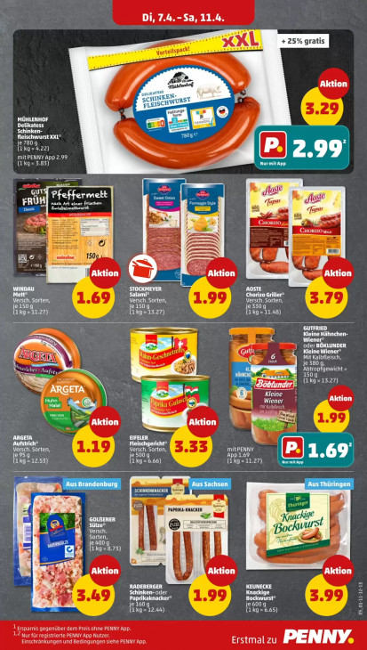 Bitte beachten Sie, dass dieser Text automatisch generiert wird und möglicherweise Fehler enthältDi, 7.4.-Sa, 11.4. + 25% gratis tanhol NY Aktion SC Ss’ walt vs | MÜHLENHOF Delikatess eg Schinken- [23 fleischwurst XXL* je 780 (1 kg = 4.22) u 99 mit PENNY App 2.99 (I kg=3.83 mit App me Es rd ur ae I ‚Sweet Onion B 1) FRÜH ae u BE nach Art einer frischen » we 4 es N ; ms > % À | À CHORIZO sun Er) FEN N Windes 15 | Aktion 3 Aktion Aktion WINDAU STOCKMEYER Salami* Chorizo Griller* Versch. Sorten, ICT CU Versch. Sorten, tee) ETEN FE CRE GUTFRIED Kleine Hähnchen- EA LU oder BÖKLUNDER ed Kleine Wiener* Et Mit Kalbfleisch, je 3809, Abtropfgewicht = Ur AE a Me =13.27) EET “SST ARGETA Kleine CT Wiener Aktion GA Se mit Kolbfleisch, er — Saitli CET De or | PAU Aktion ARGETA EIFELER | Aufstrich® Fleischgericht* Versch, Sorten, Versch. Sorten, mit PENNY je500g (CENT) TERRES (1kg = 6.66) rt en CET dt Er CAC Pr FT Z Fr PAPRIKA-KNACKER 9 = ut |" GOLBENER st | Versch. = chr: 74 Es Bo Sorten, 4 je400g (aka =8.73) | | Aktion Aktion Aktion | Sd RADEBERGER KEUNECKE EU ete Knackige Paprikaknacker* Bockwurst* et je 600 (Ikg=12.44) (1.kg=6.65) 05_01-11-12-13 x 1 Ersparnis gegenüber dem Preis ohne PENNY App. AA NNT TA schee EN Dee eN Erstmal zu PENNY.
